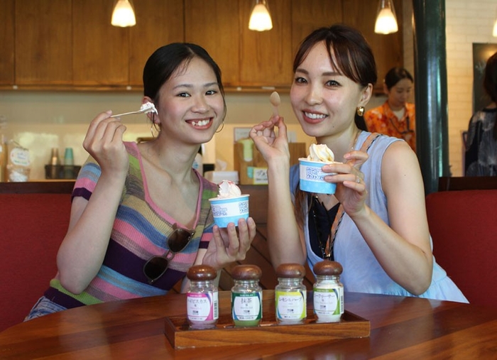 次に、シークヮーサー塩・抹茶塩といったトッピング塩をふりかけて味の変化を楽しむという“二段階の美味しさ”が魅力です。
