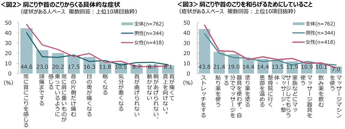 クロスマーケティング社が全国20歳~69歳の男女を対象に実施した「肩こりや首のこりに関する調査(2023年)」によると、40代を中心とした女性の76%が肩こりや首のこりの症状があると回答(男性は62.5%)。その対策として、「ストレッチ」「塗り薬」「器具を使わない自分でのマッサージ」など、プロのマッサージ師や専用器具を介さない自己流での対処法が上位回答を占め、根本的な解決には遠いという実態が見受けられます。