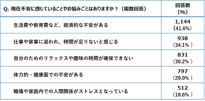 1位は経済的な不安、2位と3位は時間に関する悩み
