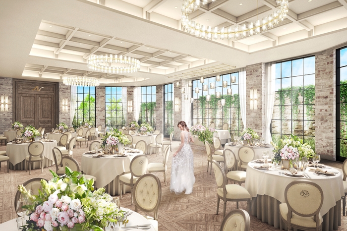 個性豊かなデザイナーのブティックが並ぶダウンタウンのノリータ地区は、マンハッタンの流行発信地としてニューヨーカーに人気のエリア。カジュアルながらもファッショナブルな人々が街路を散策し、道路沿いのよく知られたカフェ、シックなバー、流行のレストランに入っていく―――そんな流行の気風にあふれた魅力的で上品な地域をイメージして、新館「ノリータ」はデザインされました。白とレンガのノスタルジックな雰囲気と、流行レストランや高級ブティックの洗練さが融合した、おしゃれでオリジナリティを求める花嫁におすすめの新会場です。