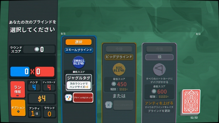 各ボスブラインドレベルにはそれぞれ制約があり、ボスブラインドをクリアすると、アンティが1ラウンドにつき1ポイントずつ上がり、それに応じてすべてのブラインドレベルの難易度が上がるのはもちろん、レベルクリアに必要なスコアもどんどん高くなっていくので、プレイヤーは十分な準備と戦略を立てて臨まなければなりません。