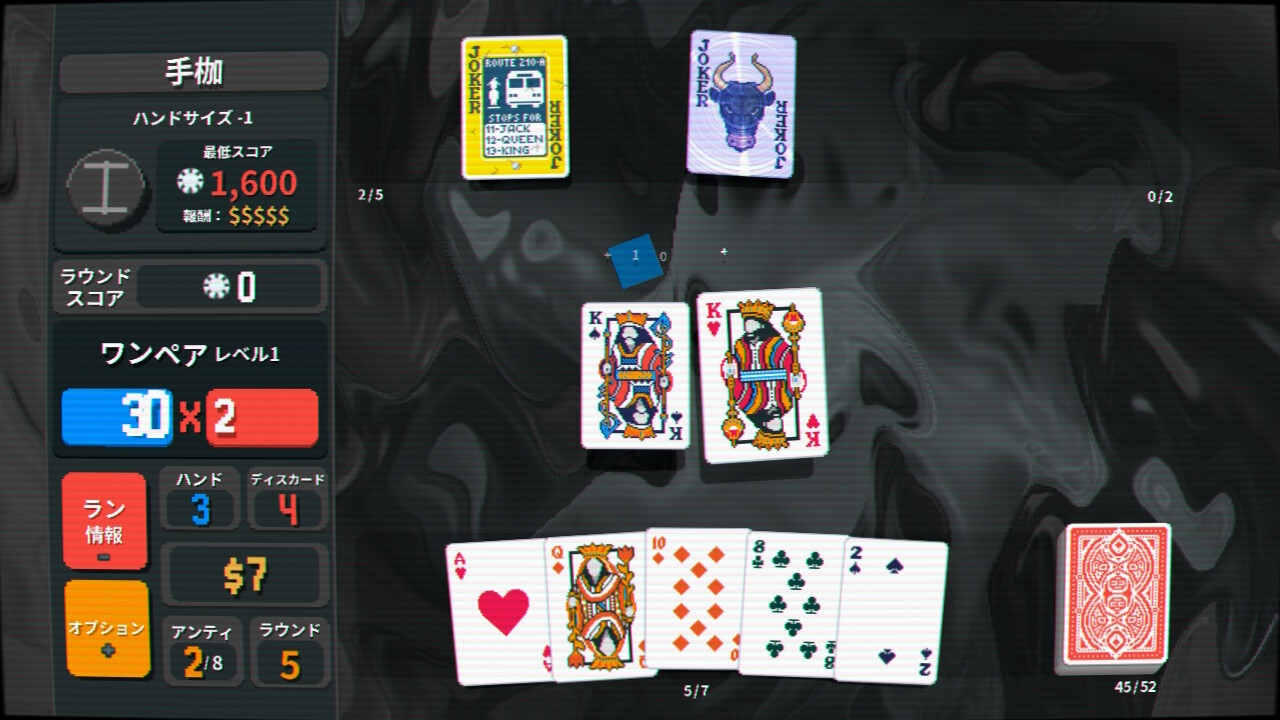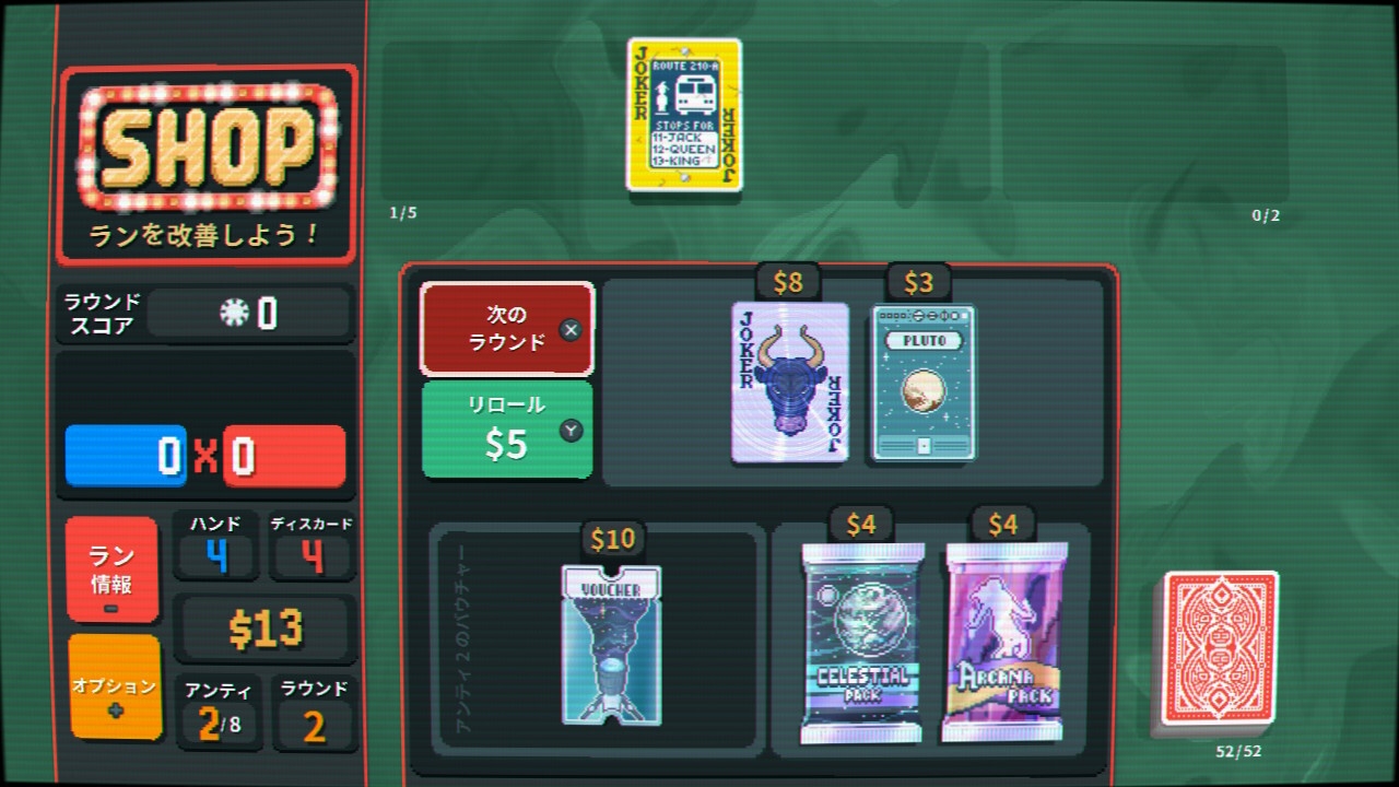 プレイヤーはストレートフラッシュ、フォーオブアカインド、フルハウスなど、様々なポーカーハンドを限られた手数の中で作り出し、スコアを稼いでいきます。定められたスコアを達成すると、次のラウンドに進むことができます。各ラウンドで獲得できるコインを使って、ショップで様々な機能カードを購入することができ、さらなるゲームプレイの可能性が広がります。
