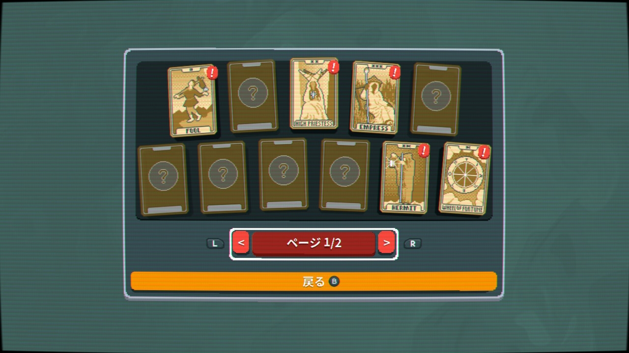 タロットカード:ラウンド毎に独立した場所に置かれる消耗品のカードで、プレイヤーはスロットに2枚のタロットカードを置くことができますが、状況によってはスロット数が変動することがあります。タロットカードは、カードのスートを変換したり、カードの枚数を減らしたり、複製したりと、プレイヤーの既存のデッキを変更するために使用することができます。