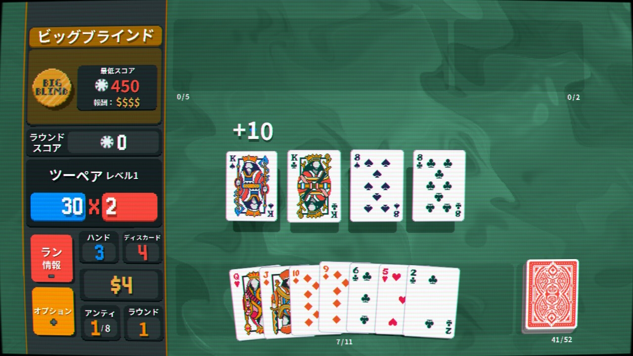 各ラウンドでは、プレイヤーは限られた手数と捨て札の中で様々なポーカーハンドの組み合わせを作り、そのラウンドの必要スコアに到達しなければなりません。