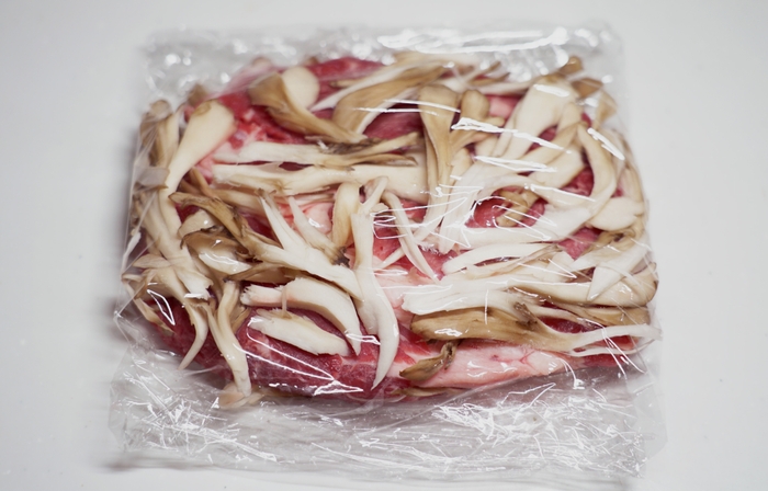 ラップに、裂いたまいたけ1/2を敷き、ステーキ肉を置いて、さらに残りの1/2のまいたけを上にのせて包み、冷蔵庫で3時間保存する。