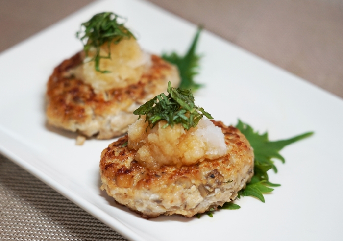 ⑤ハンバーグを皿に盛り、すり下ろした大根にポン酢をかけ、大葉を散らして完成。