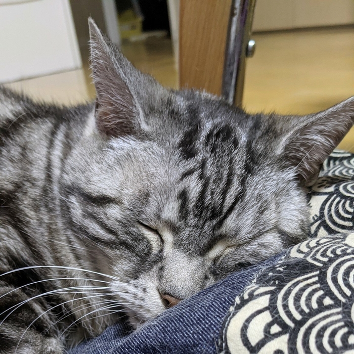 いびきをかく猫。リラックス具合が伝わってきます。抜け毛の季節なので大変なんですが、羽毛のベッドを愛用中です。癒やされちゃう動画です。