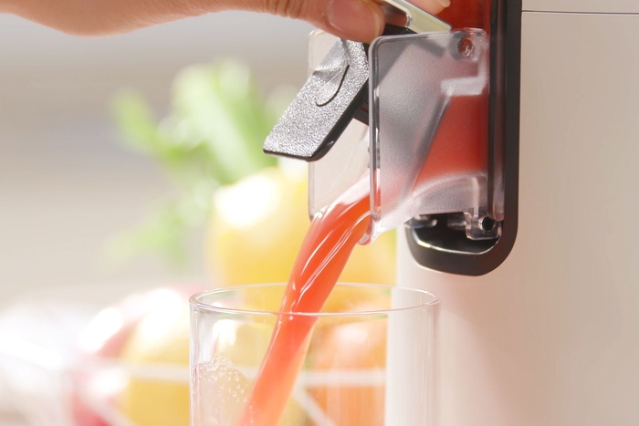 ジューサー前⾯には搾汁が進むにつれあがる「ジュースポケット」がついているので、搾汁量やジュースの⾊を直感的に確認できます。