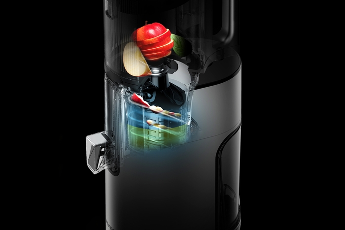 また、⾷材を細かく切る必要のない「メガホッパー」、硬い野菜から柔らかい果物・ナッツ類まであらゆる⾷材に対応する「マルチスクリュー」、簡単な分解・洗浄がもたらす「使いやすさ」など、ジュースを毎⽇の健康習慣として楽しく続けていただけるよう、様々な最新技術を採⽤しています。