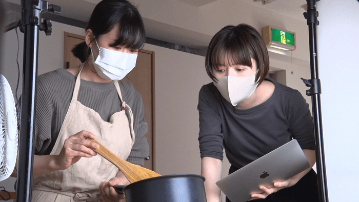 毎月約400本のレシピ動画を制作する『クラシル』。カメラと照明をセッティングしたテーブル15台が用意されたキッチンスタジオで、管理栄養士や調理師など料理に精通した総勢30名の“クラシルシェフ”がそれぞれのブースで調理をし、撮影までこなしています。統括するのはフードラボチームのリーダー田部晴菜さん26歳。クラシルシェフが調理・撮影したものをチェックするほか、自身もレシピを開発して撮影を行っています。