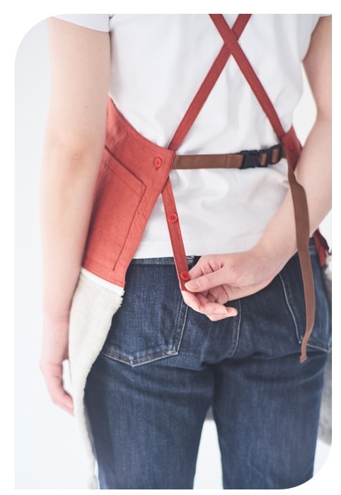 エプロン部分の生地には撥水加工を施したリネン、コットン混合素材を使用し、ナチュラルでありながら 上質な風合いに仕立てています。肩ひもは、首や肩に負担をかけにくいクロスデザインで、3つのボタンで 長さ調整が可能。また、腰ひもにはバックルを採用し、着脱のしやすさにもこだわりました。機能性だけではなく、着用した際の快適さや美しいシルエットまでも追及した、和田さんのこだわりや思いのつまったエプロンです。