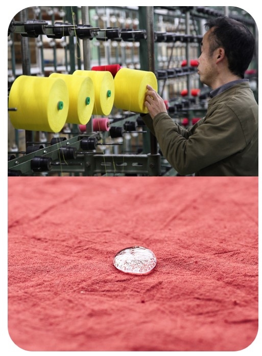 エプロン部分の生地は、リネンとコットンの混合素材に撥水加工を施しました。ワッシャー感のある、ナチュラルでありつつ上質感のある生地を、着用した時のきれいなシルエットにもこだわり、エプロンに仕立てました。