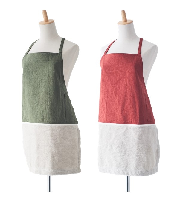 タオル部分には、その品質の高さで国外からも注目を集める今治産のタオルを使用。エプロン部分もすべて国内で縫製をしており、日本の丁寧なものづくりを感じていただけます。