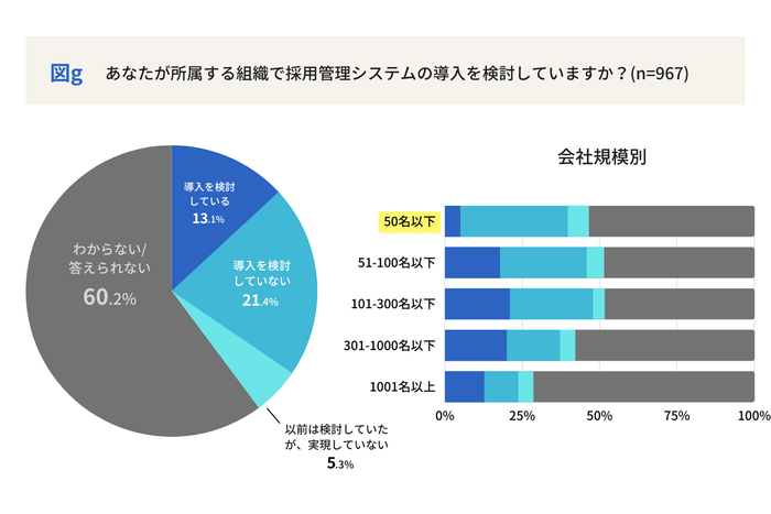 採用活動の改善・強化や情報の一元管理による人的ミスを防ぐことができる「採用管理システム」。一般にはまだ馴染みが薄いこのシステムですが、「導入を検討している」と答えた回答者の所属企業規模をみると、社員が51名から100名の規模では17.8%がすでに検討を始める傾向が判明しました。