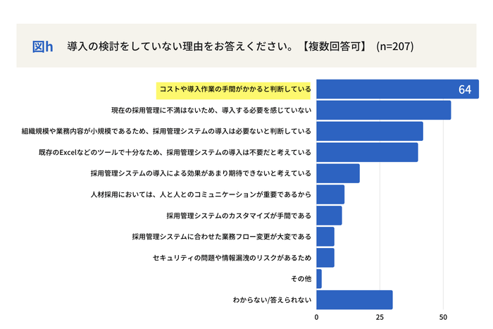 また「導入の検討していない」理由について、「コストや導入作業の手間がかかると判断している」との回答に票が集まりましたが、業種問わず人材不足が社会の課題となっているからこそ、より自社のポジションにマッチし、退職者を出さない質の高い採用活動を行うためにシステムでの管理が必要な時代が到来したといえそうです。