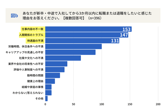 さらに「新卒・中途で入社してから3か月以内に転職または退職をしたいと感じた理由」について質問したところ、第1位「仕事内容の不一致」、第2位「人間関係のトラブル」、第3位「待遇面の不満」となりました。この結果から、職場環境の改善に加え、採用段階で求職者と企業側が明確なコミュニケーションを行い、求められる仕事内容や役割、スキルの適合性について、より具体的な情報交換をすることが必要といえます。