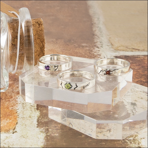 石神千空、あさぎりゲン、獅子王司の3キャラクターのイメージカラーの天然石を中央にあしらったシンプルなリングには、各キャラクターの顔のひび等がデザインされたファン必見のプレミアムアイテム。
