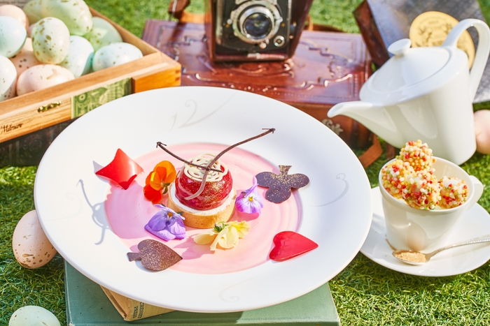 春のアフタヌーンティーは、白うさぎならぬ“イースターバニー”からの招待を受けたアリスが訪れた「不思議の国の花祭り」がテーマ。はじめにアシェットデセール「The Flower Clock~不思議の国への招待状~」を受け取って、色鮮やかな春の花々が咲き誇る不思議の国へと旅立ちます。うさぎに見立てたグリオットケーキ、春のガーデンをイメージしたシュークリーム、ステンドグラスのように色鮮やかなアイシングクッキーなどのスイーツや軽食、スコーンを、マリアージュフレール社の香り高い紅茶とともにご堪能ください。