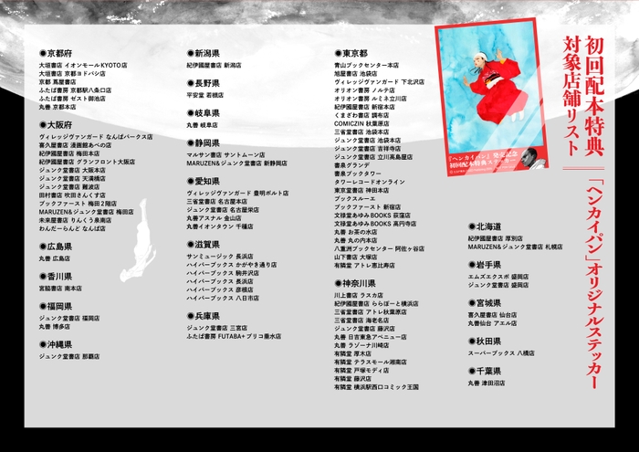 初回特典の配布対象書店一覧を画像にまとめておりますので、画像で送らせて頂きます。