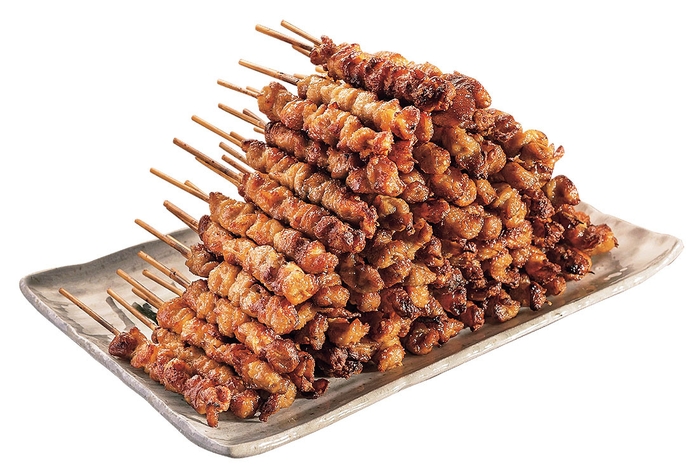 鶏1羽から串1.5本分ほどしか採れない希少な部位である首皮を使用。焼いてはタレに漬けて寝かせを繰り返し、72時間かけて完成。