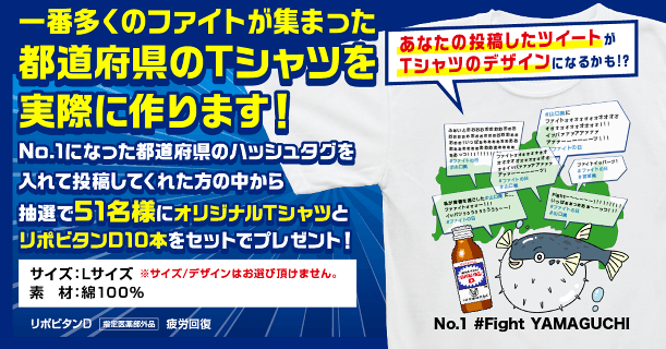 「ファイトNO.1都道府県×リポビタンD」の限定オリジナルTシャツと、リポビタンD10本をセットにして51名様にプレゼント。