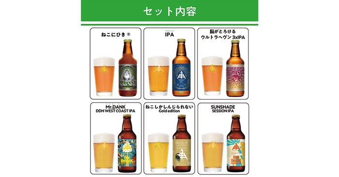 ①IPA ②ねこにひき ③脳がとろけるウルトラヘヴン 3×IPA ④Mr.DANK DDH WEST COAST IPA ⑤ねこしかしんじられない Gold edition ⑥SUNSHADE SESSION IPA