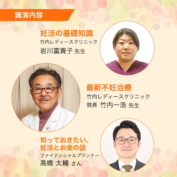 前半は、竹内レディースクリニックの岩川先生が不妊治療の基礎知識を、最新の不妊治療について院長の竹内先生が講演いたします。後半は、不妊治療の保険適用に向けた動きや、助成金制度の改正で注目を集めている治療費とお金について、ファイナンシャルプランナーの高橋さんが講演いたします。