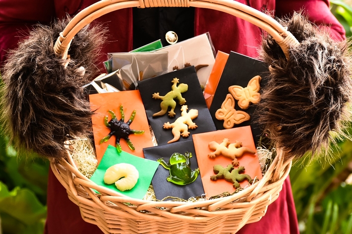 イリオモテヤマネコや、ヤエヤマセマルハコガメなど西表島の希少な生き物に仮装したスタッフが1日に数回、ジャングル Kichiに登場します。「トリック オア トリート」と言うと、カンムリワシならカエルのグミやトカゲのクッキー、ヤエヤマセマルハコガメならクモのグミなど、その生き物の好むエサをモチーフにしたお菓子をもらえます。生き物ごとにもらえるお菓子が異なるため、色々な種類を集めることを楽しめます。