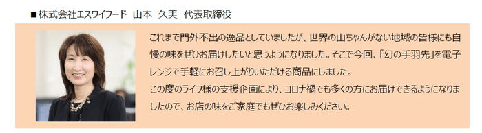 これまで当社では、応援企画としてコロナ禍により影響を受けた生産者や企業の支援を目的に、各地の銘産品を販売してまいりました。今回は居酒屋“世界の山ちゃん”などを運営しているエスワイフードの「幻の手羽先」を販売いたします。お酒のお供に最適な居酒屋の味を、ご家庭で簡単にお楽しみいただけます。