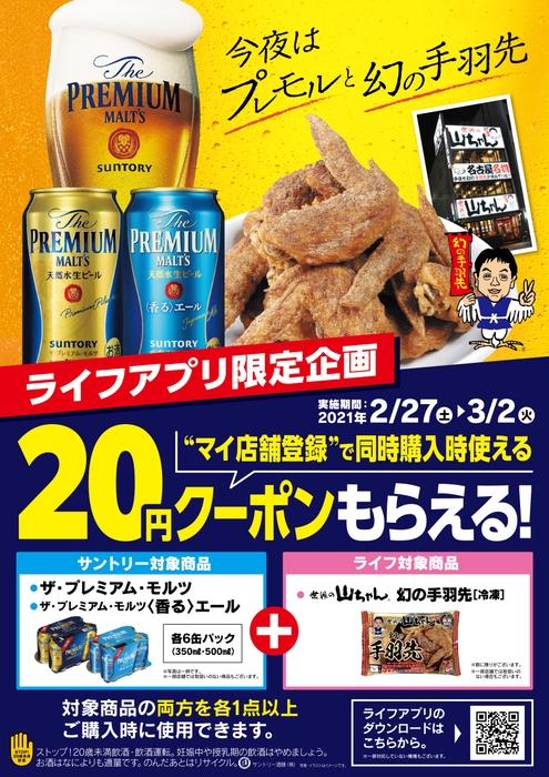 マイ店舗登録をすると「世界の山ちゃん 幻の手羽先」と、「ザ・プレミアム・モルツ」を同時にご購入いただいた際に使える20円クーポンをプレゼントいたします!