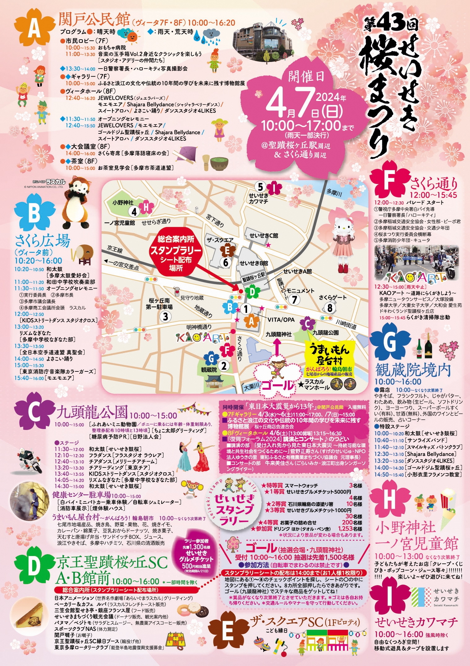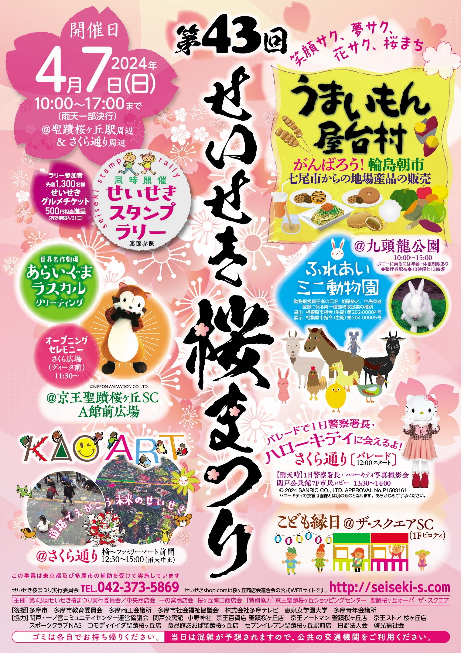 当日は聖蹟桜ヶ丘駅と、さくら通り周辺を中心に「あらいぐまラスカル」グリーティングや、1日署長「ハローキティ」のパレードなど、9つの会場で様々なイベントが開催される予定です。