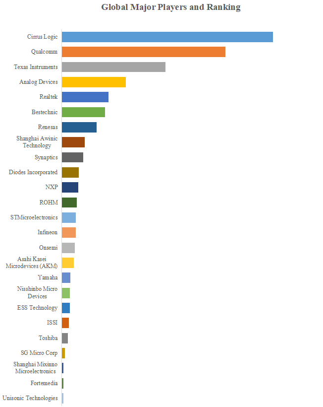 YHResearchのトップ企業研究センターによると、オーディオチップとオーディオアンプの世界的な主要製造業者には、Cirrus Logic、Qualcomm、Texas Instruments、Analog Devices、Realtek、Bestechnic、Shanghai Awinic Technology、Renesas、Synaptics、Diodes Incorporatedなどが含まれている。2023年、世界のトップ10企業は売上の観点から約69.0%の市場シェアを持っていた。