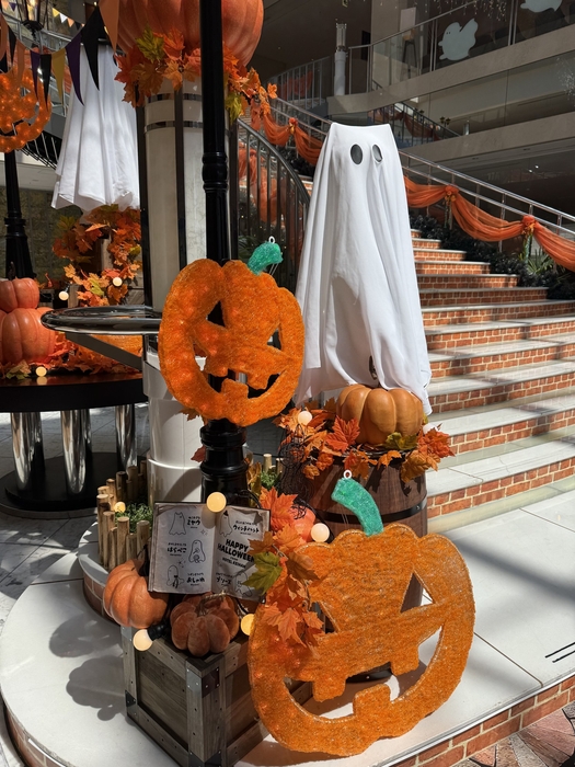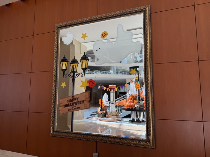 「パンプキンシティ」に変身したホテル内は、たくさんのパンプキンとさまざまなおばけたちで賑やかに彩られました。エントランスや大階段、鏡の中まで、各所に隠れるかわいいおばけたちと楽しいハロウィンを過ごしましょう。大きなパンプキンと撮影できるフォトスポットでは、ぜひ記念撮影を。
