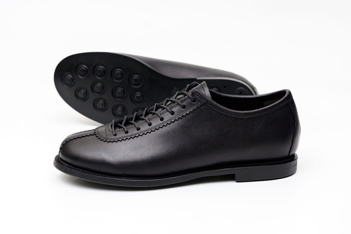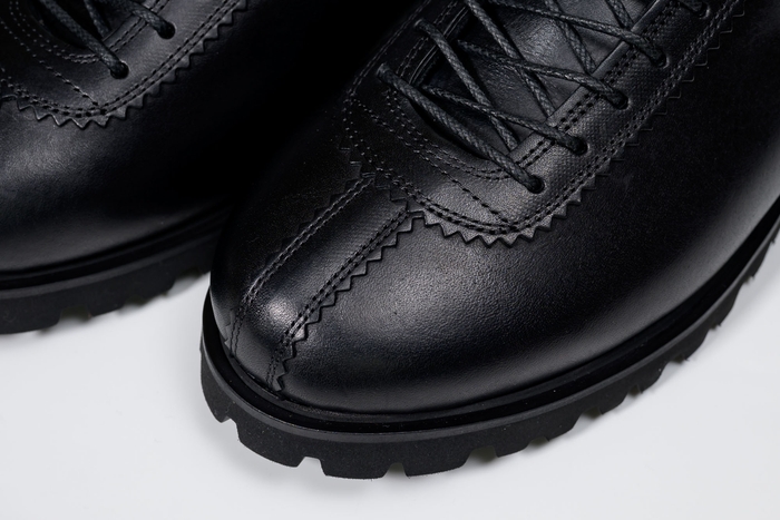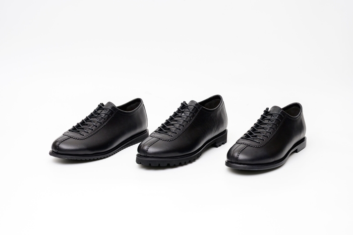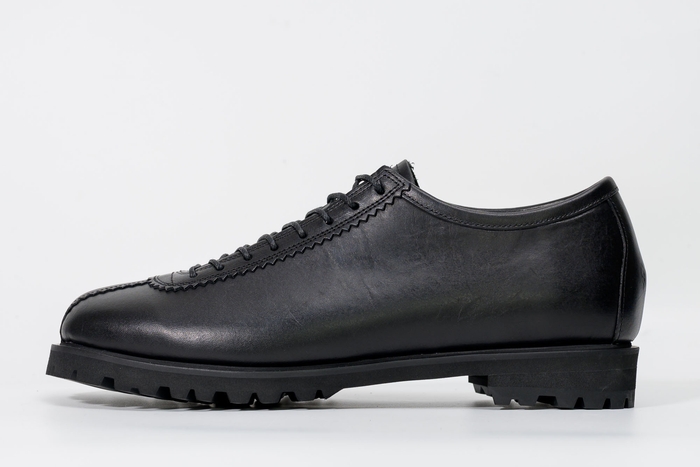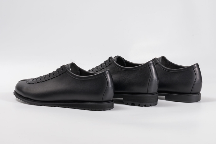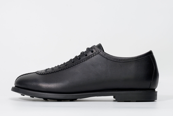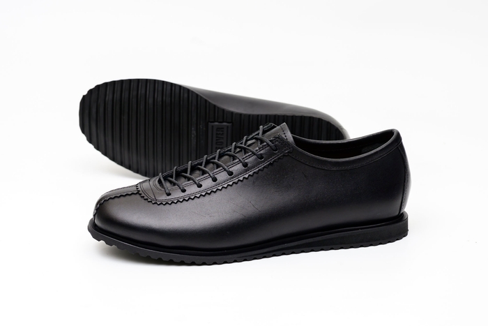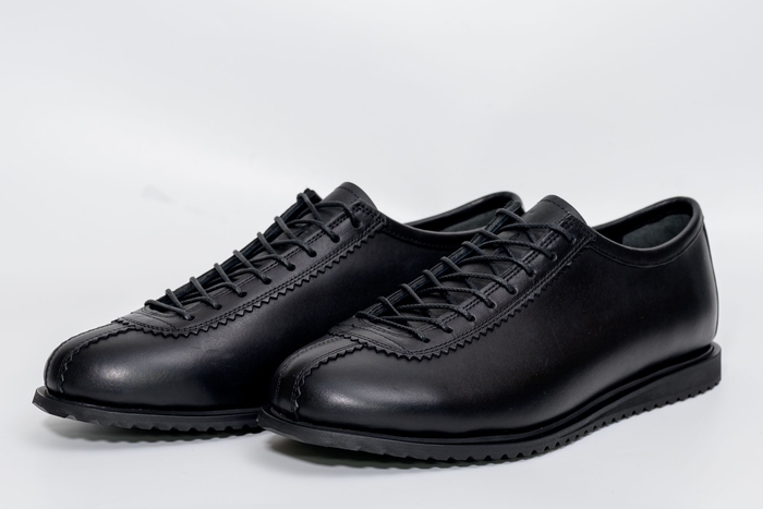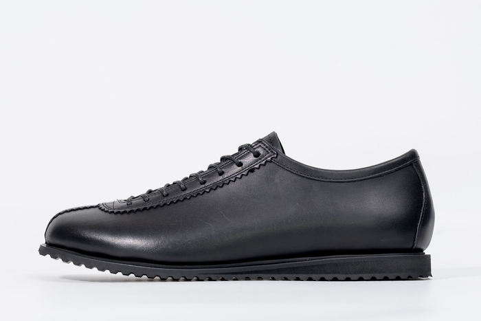 1970年代のスポーツシューズを現代的に再構築したブラックスニーカー。老舗タンナーによる上質な厚口オイルレザーはヴィンテージ感を醸し出しながら、洗練されたシルエットが特徴です。ピンキング等の細部へのこだわりと、無駄を削ぎ落したデザインはブランド哲学を体現しています。紳士靴ラスト(足型)を採用し、カジュアルからビジネスカジュアルまで対応します。ソール交換可能なマッケイ製法は、長く愛用できる一足となっています。