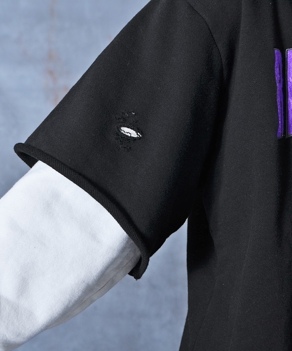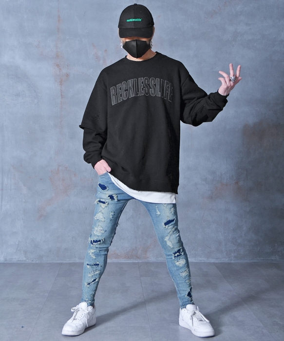 フロント胸元には、カレッジロゴ風の刺繍でコンセプトである「RECKLESS LIFE」をデザインしました。