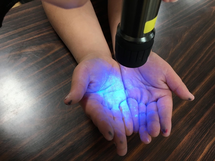 KPSの手洗い指導BOXを各施設に設置し、手を洗えているかチェックすることで自身の手洗いを見直す活動。手を入れてブラックライトを照らすと、汚れが残っている箇所が青く光り、手洗いが不十分な箇所を確認できる