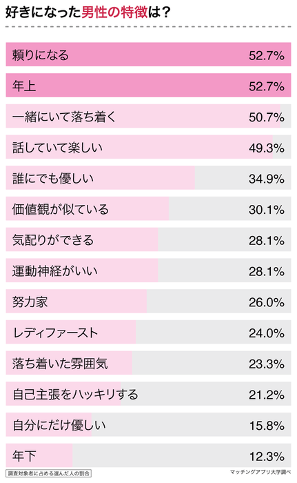 「これまで好きになった男性の特徴は?」と聞いたところ、1位は「頼りになる(52.7%)」、2位は「年上(52.7%)」、3位は「一緒にいて落ち着く(50.7%)」、4位は「話していて楽しい(49.3%)」という結果でした。