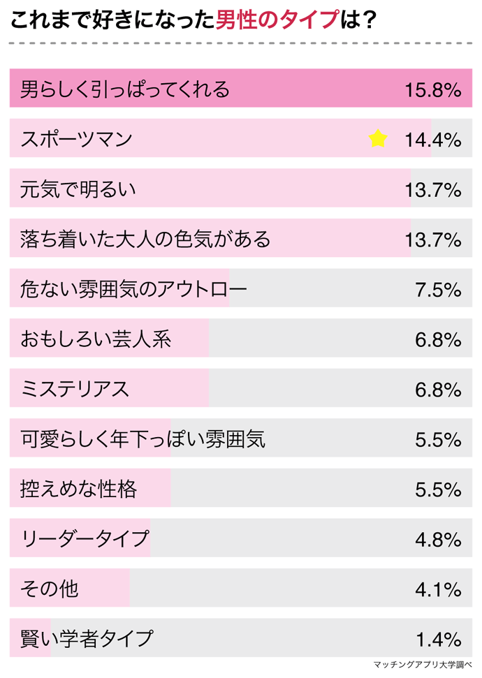 その結果、上位1位〜3位に57.6%の票が集まりました。1位は「男らしく引っぱってくれる(15.8%)」、2位は「スポーツマン(14.4%)」、3位は同率で「元気で明るい(13.7%)」「落ち着いた大人の色気がある(13.7%)」です。
