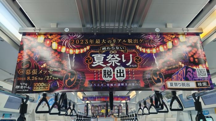 全世界で累計1090万人以上を動員しているリアル脱出ゲームを企画制作する株式会社SCRAP(本社:東京都渋谷区、代表:加藤隆生)は、2023年最大のリアル脱出ゲーム『終わらない夏祭りからの脱出』の開催を記念し、2023年8月14日(月)より京葉線中吊り広告を1車両ジャックした「#夏祭り脱出 公演記念列車」の運行を開始することを発表します。