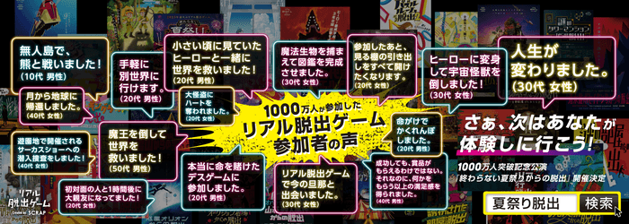 また、併せて掲出される「リアル脱出ゲーム参加者の声」は、これまで様々なイベントでリアル脱出ゲームを体験した累計1000万人以上のお客様からいただいた、「日常ではなかなかできない体験」の感想を多数掲載。実際に遊んだことがある方は共感できる声を探してみるのもおすすめです。遊んだことのない方にとっては非日常を体験できる「リアル脱出ゲーム」の魅力が存分に伝わる内容となっています。