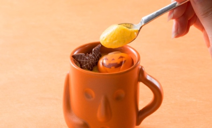 ハロウィン気分があがるチョコレートオーナメントがのったほっこりかぼちゃぷりん。