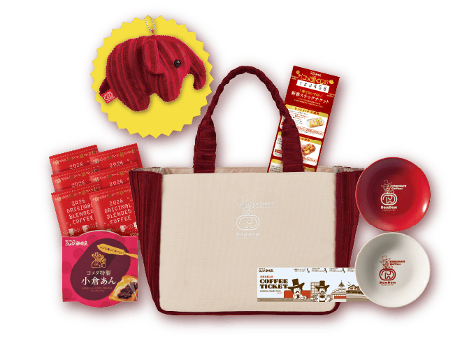 お正月のコメダ珈琲店を彩る福袋、2026年は全国に29店舗(2025年10月末時点)を展開するハンバーガーチェーンであり、象のキャラクター「どむぞうくん」をはじめとするオリジナルグッズでも大人気の「ドムドムハンバーガー」とのコラボレーション!