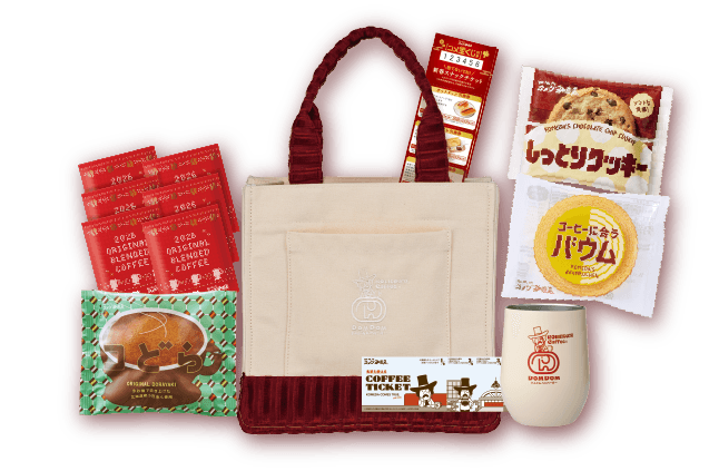 さらに、ここでしか手に入らないドムドムハンバーガーとのコラボ商品も!コメダ珈琲店のソファー柄生地を使用した「どむぞうくんキーホルダー」や、コメダのくつろぎナビゲーター「コメダンディ」と「どむぞうくん」が一緒に描かれたイラスト入りのプレートやステンレスタンブラーなど、日常使いしやすいアイテムをご用意しました。加えて、福袋オリジナルデザインのドリップコーヒーや、コーヒーチケット、スナックチケットもセットに。各店舗数量限定につき、なくなり次第予約および販売を終了します。この機会を、ぜひお見逃しなく!
