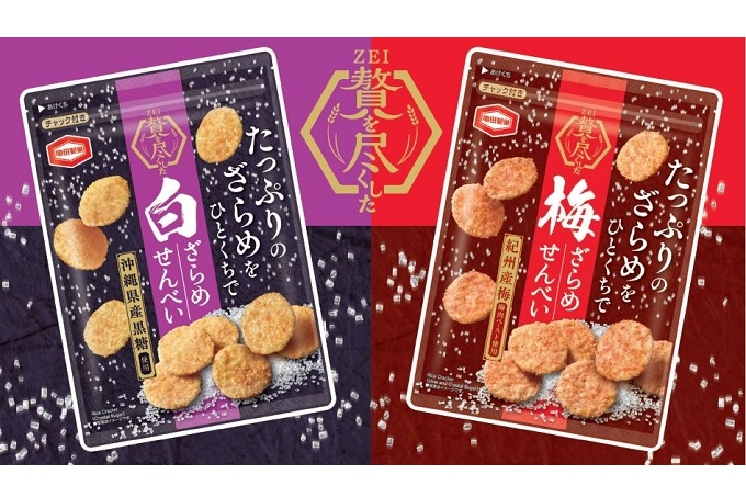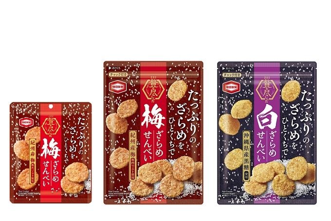 亀田製菓株式会社(本社:新潟県新潟市、代表取締役社長 COO:髙木 政紀)は、たっぷりのざらめがひとくちで味わえる『105g 贅を尽くした 白ざらめせんべい』(以下:『贅を尽くした 白ざらめせんべい』)、『90g 贅を尽くした 梅ざらめせんべい』(以下:『贅を尽くした 梅ざらめせんべい』)を全国のスーパーマーケットにて、『30g 贅を尽くした 梅ざらめせんべい』(以下:『贅を尽くした 梅ざらめせんべい』)を全国のコンビニエンスストアにて、3月25日(月)から発売します。