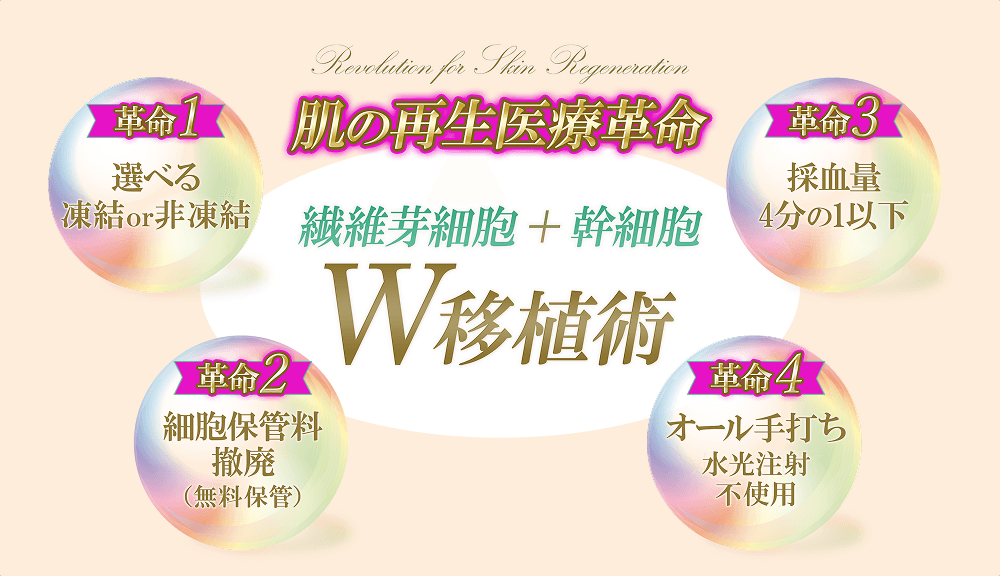 このため、当院では、この2つの細胞の肌への同時移植により最大限の相乗効果が期待できると判断し、今般、「W移植治療」を開発しました。
