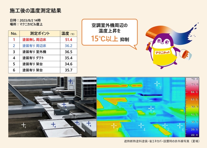 この度、省エネルギー対策ソリューションとして、投資金額を抑えつつ高い省エネ効果を得ることが可能な、遮熱断熱塗料「マクニカット」の販売を開始いたしました。「マクニカット」は太陽からの放射線による熱交換を防ぐための遮熱と熱を伝えない断熱を併せ持つ塗料で、塗布することにより熱交換機能を有する電気機器の稼働効率を大幅に向上させることが可能となります。マクニカでは2023年より先行販売による施工を実施しており最大40%(※使用条件や地域場所による)の消費電力の削減と、CO2排出量削減の効果を確認しています。今後は、製造施設や商業施設など大型な室外機を大量に有する場所への導入により、エネルギー消費削減効果を目指します。