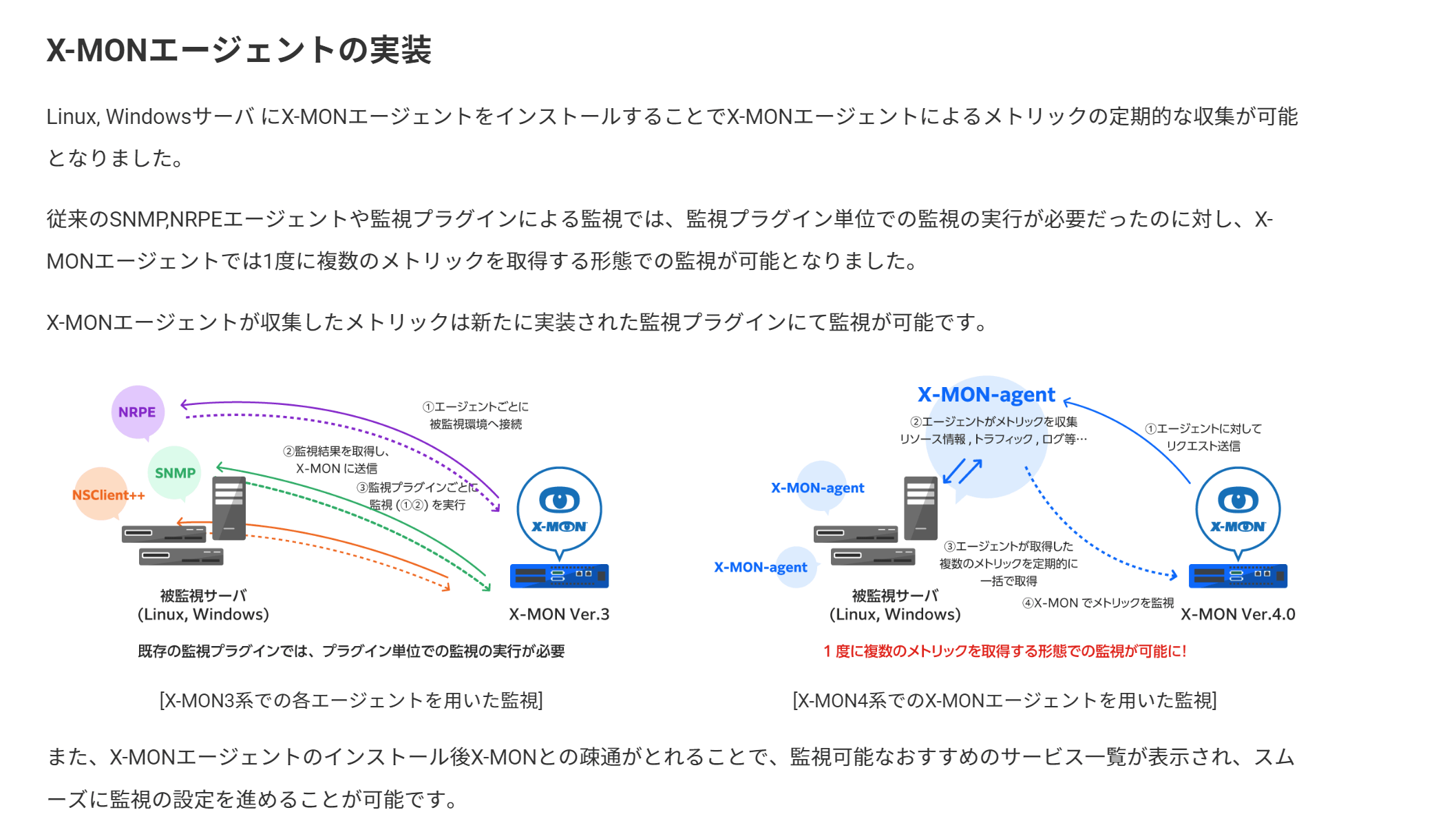 ・Linux、WindowsサーバにX-MONエージェントをインストールすることで、エージェントによるメトリックの定期的な収集が可能となりました。