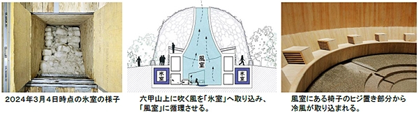 また、「自然体感展望台 六甲枝垂れ(建築家:三分一博志)」では、冬に氷を貯蔵した「氷室(ひむろ)」の扉を開放して六甲山上に吹く風を取り入れる「氷室開き」を7月13日(土)に実施する予定で、氷室の氷が無くなるまで展望台内部の「風室(ふうしつ)」にて自然の力だけで神戸市街地と比べてマイナス約10度の涼が楽しめる「冷風体験」を開催します。