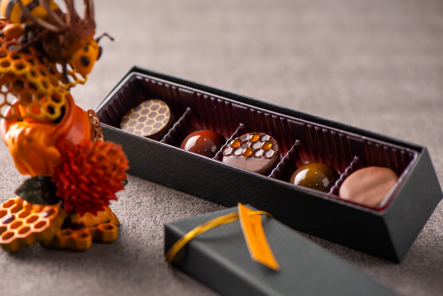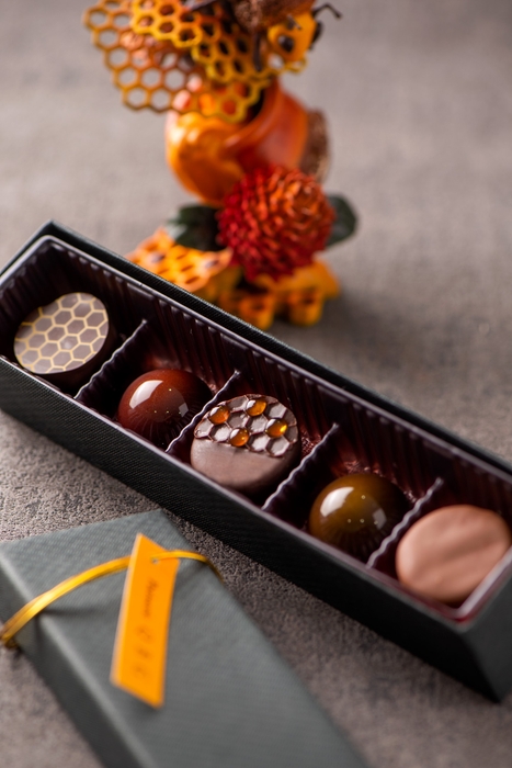 この度、受賞作をベースにした5粒のボンボンショコラ「ショコラ クインビー」を、当社直営洋菓子店「パティスリーQBG」「QBG レディベア」にて2月9日より数量限定で販売いたします。