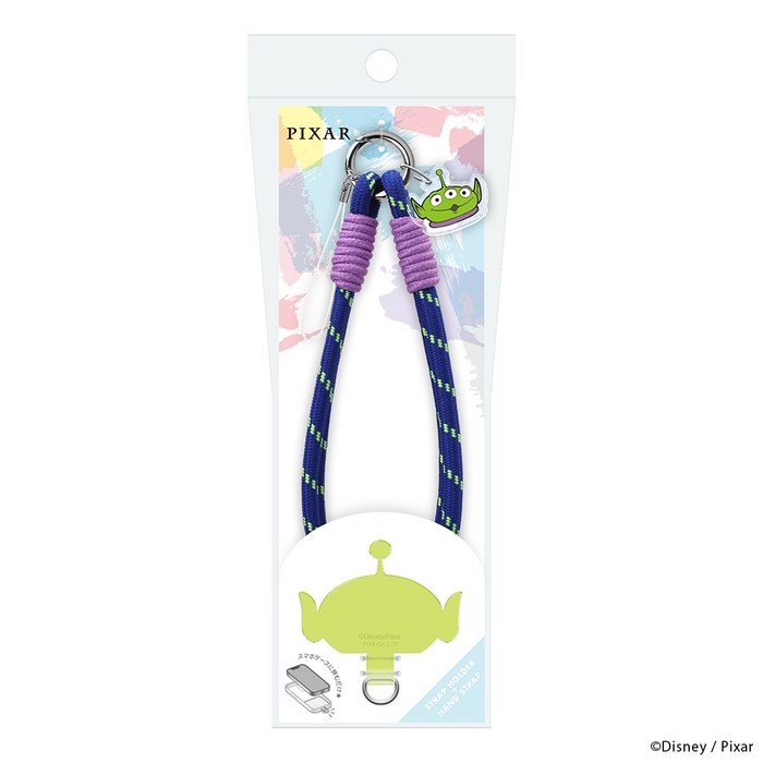 お持ちのスマホのケースにストラップホールが無くても、ケースとスマホの間に挟んでストラップホールを装着できるストラップホルダーを付属したハンドストラップです。ハンドストラップはロープタイプで、キャラクターのモチーフとなるカラフルな色合いです。